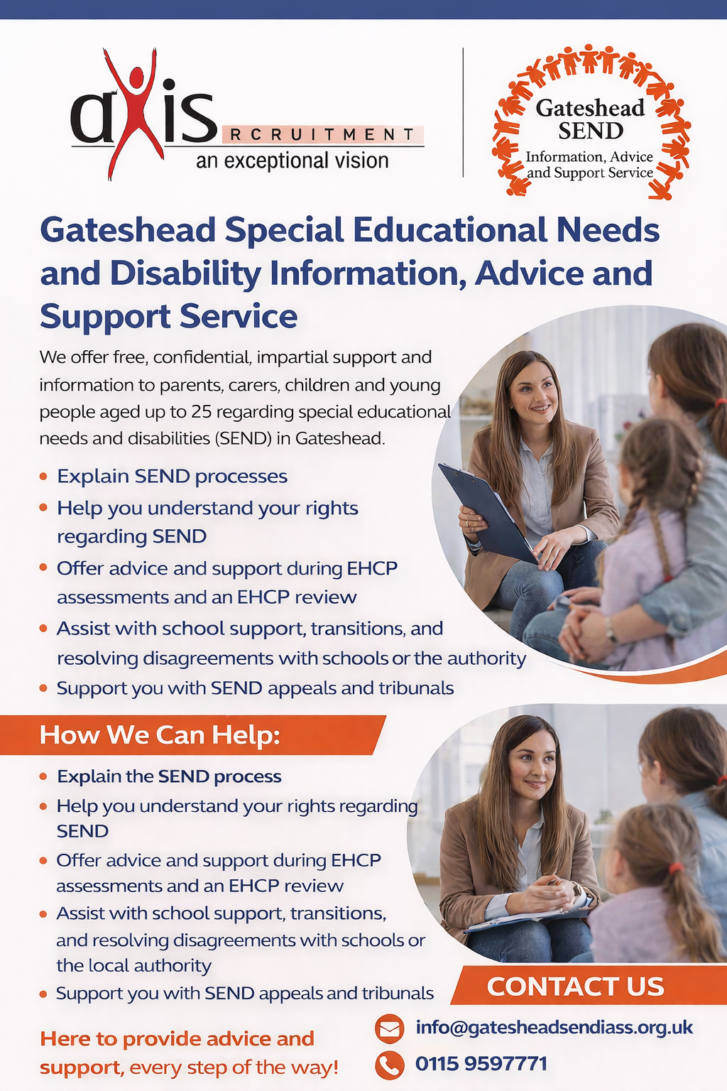 From this date, Axis will provide free, confidential, and impartial information, advice, and support to children and young people with special educational needs and/or disabilities (SEND), and to their parents and carers, across Gateshead.