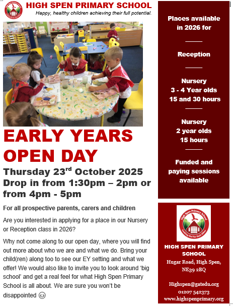 This is an ideal opportunity to visit our Early Years setting and find out more about High Spen School and what we offer.